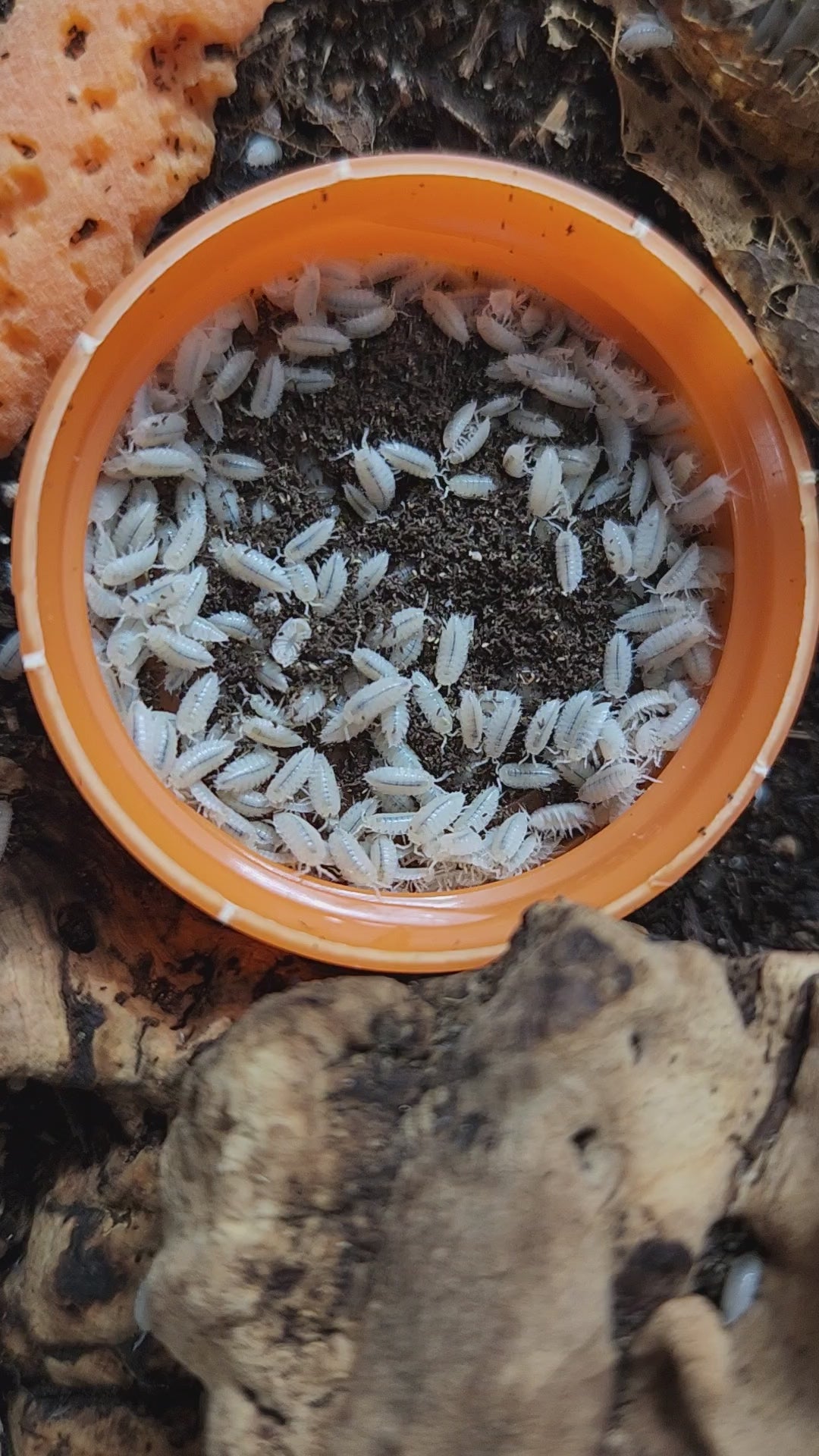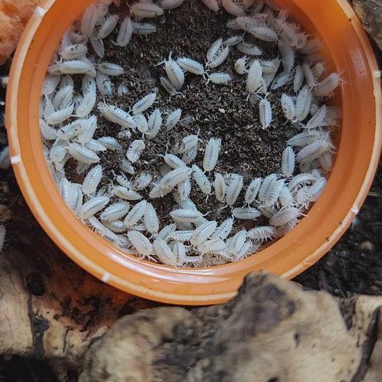 Dwarf white isopods are small, hardy detritivores ideal for bioactive terrariums and as occasional feeders for small reptiles and amphibians. These isopods thrive in humid, well-ventilated enclosures with plenty of leaf litter, cork bark, and decaying wood to burrow through. They prefer temperatures between 65–75°F and require consistent moisture. Feed a varied diet of vegetables, dried leaves, and protein-rich supplements. With minimal care, they reproduce readily, establishing a self-sustaining cleanup crew that breaks down waste and enriches substrate. Perfect for maintaining bioactive vivariums or breeding as a live food source.