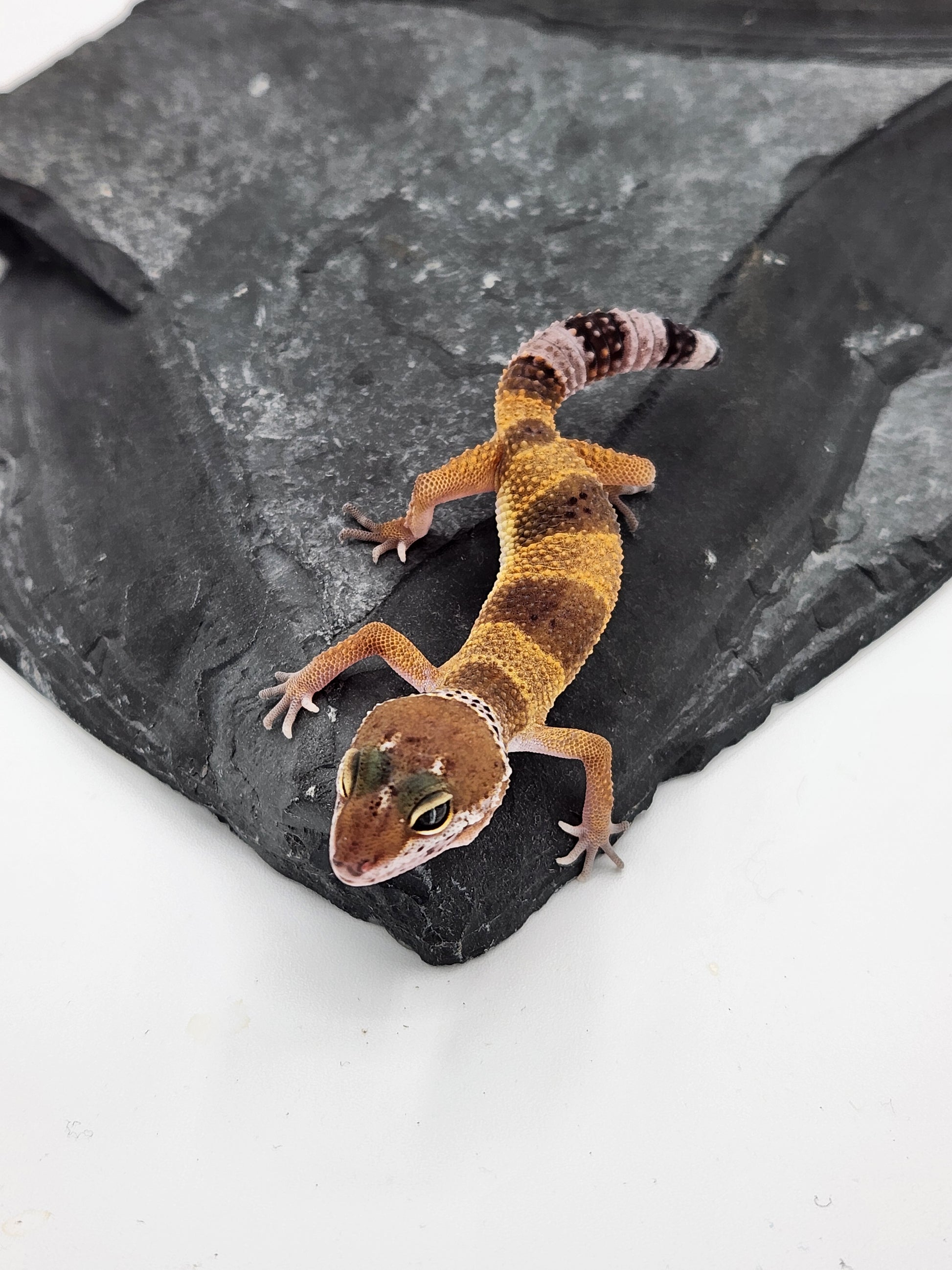 This little leo exhibits the classic traits of the species, with bands changing to spots as it grows. Super sweet and curious.